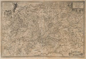 [CARTE] - ORTELIUS. Abraham. Lorraine. 1587. Carte gravée. 41 x 54 cm. Cadre en bois du XXème siècle. Belle et rare carte gravée, signée dans la planche en bas à droite.