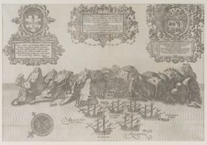 [CARTOGRAPHIE] - LINSCHOTEN. Jan Huygen van. Ile de Saint-Hélène. (1596). Carte gravée. 33 x 89 cm. Cadre contemporain en bois doré. Pliure centrale. Pliure horizontale en partie inférieure. Belle vue gravée de l'Ile Saint-Hélène. En haut à gauche, les armoiries du Portugal. - En haut à droite, dédicace à "Philippo Eduardo et Octaviano Secundi Fuggeris" surmontée de leurs armoiries.