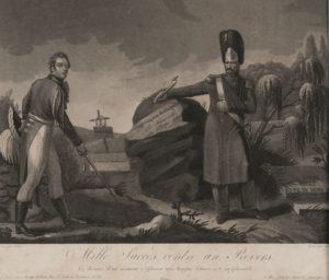 CHARON. Louis-François. Mille succès contre un revers. Le revers d'un moment s'effacera une longue Gloire est ineffaçable. Paris, Jean, Editeur, Rue St Jean de Beauvais N°10., (1819). Aquatinte à la roulette figurant une allégorie à la gloire de l'Empire Gravé par Louis-François Charon d'après Aubry. Un grenadier, le bras en écharpe, écrit sur le roc à la pointe d'une baionnette : «Vingt cinq ans de Conquêtes. La France seule contre l'Europe entière». En face de lui, à g. Wellington, tête nue, écrit sur le sol à la pointe de son épée : «Waterloo 1815. Invasion de la France par cinq puissances alliées». La gravure possède un pendant : La Valeur est immortelle en France (conscrits de 1814).
