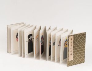 [CHINE] - Carnet de peinture chinoise de visages maquillés de l'Opéra de Pékin. (XIXème-XXème siècle). carnet (replié) 19 x 12 cm. Plats couverts de soie, accordéon. Vignettes peintes contrecollées. Magnifique carnet en accordéon figurant 12 portraits d'acteurs et actrices maquillés de l'Opéra de Pékin, peints finement à la gouache. Chaque portrait sur la gauche fait face à un idéogramme désignant le personnage joué.