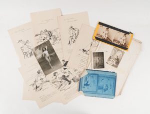 [EROTICA-CURIOSA] - Ensemble de curiosa comprenant trois tirages photographiques de nus ou de scènes érotiques, impressions érotiques figurant des jeux libertins du XVIIIème siècle ou caricaturaux, et impressions de "Communiqués officiels" comparant la tactique militaire aux jeux érotiques et divers. (Fin du XIXème siècle- Début du XXème siècle). dimensions max. : 27.5 x 18 cm, Certaines avec rousseurs.