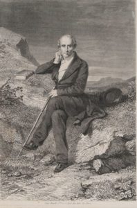 GIGOUX. D'après Jean. Charles Fourier. Paris. Imprimeur Frault Jeune. (milieu du XIXème siècle.). Cadre contemporain en bois verni, sans vitre. Mouillure sur le côté gauche. Lithographie figurant Charles Fourier assis sur un tertre rocheux, pensif, un ouvrage et son haut de forme à ses côtés.