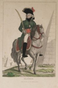 KLEBER. Paris. chez Jean. (XIXème siècle). Lithographie. 29.5 x 21, sous cadre. Lithographie mise en couleurs figurant le général Kléber à cheval, le sabre levé, devant les pyramides d'Egypte. Cachet de collection en bas à droite : "Bernard".
