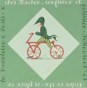 (PUBLICITE - FAUCHON). Chez Fauchon. confiseur et patissier. Restaurant et salon de thé. Aquarelle originale sur carton fort. 205 x 270mm, représentant un gentilhomme à bicyclette, dans un losange vert clair. Il s'agit d'un projet publicitaire du début du XXème siècle pour la célèbre pâtisserie parisienne Fauchon. L'aquarelle est entourée de l'inscription : Chez Fauchon. confiseur et patissier. Restaurant et salon de thé. 28 place de la Madeleine à Paris. 8°.