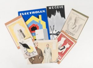 (PUBLICITE) - DUROUX. 7 aquarelles originales contrecollées sur carton, de divers formats. Maquette publicitaire, vers 1940, très colorée, non signée, pour Megève, Petrol-Hahn, Perrier, Electrolux.