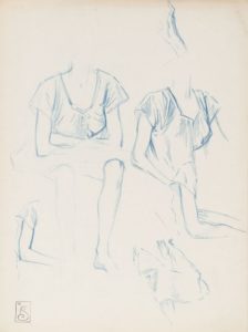 STEINLEN. Théophile. Etude de corps de jeunes femmes. Dessin au crayon bleu, avec cachet S en bas à gauche. Au verso étude de jambes féminines au crayon bleu. 26, 5 x 35 cm. Cat. 1982, 183.