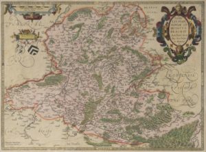 SURHON, HOGENBERG. Pays de Haynault tenu de Dieu et du soleil. Abraham Ortelius, 1584 (1595). 51 x 37. Sous cadre. Pliure centrale. Belle et rare carte gravée, mise en couleur de la région du Hainaut.
