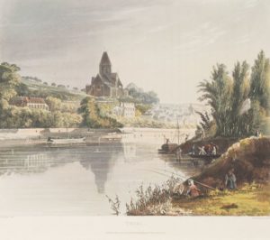 (TRIEL-SUR-SEINE). GENDALL, J. Triel. [Londres]: R. Ackermann, 1821. 33,8 x 28,1 cm. Aquatinte rehaussée en couleur.