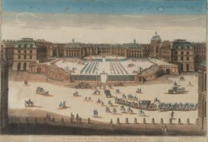 Vue et perspective du Château royal de Versailles du côté de l'entrée. Paris. chez Daumont, chez Esnauts et Rapilly rue St jacques. Gravure. 36 x 52. Cadre moderne. Belle gravure rehaussée en couleurs figurant l'entrée du château de Versailles avec une petite légende indiquant notamment la place des écuries, des appartements... Planche numérotée n°11 en haut à droite.