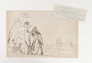 [WATERLOO] - Dragon harnachant son cheval et un tirailleur adossé contre son canon devant une citadelle. (Début du XIXème siècle). Dessin à la plume. 25 x 38.5. Légères pliures et petites rousseurs. Accompagné d'une note mentionnant "Croquis d'époque [...] exécuté par un dragon du 7e Régiment natif de St Gengoux le national ayant assisté à la bataille de Waterloo en Juin 1815. (D'après ses notes de campagne existant dans la famille) A moi donné par R. Gounard (?) antiquaire qui a acheté le casque du dit dragon du 7e Régiment." Au dos de la note au crayon : "4.02.85 Ader-Picard- Tajan".