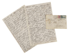 Manoscritti a inchiostro bruno su carte colorate e intestate EM della giovane figlia del Duce. 14 pagine scritte in totale. 2 buste conservate. Sono conservate le trascrizioni delle lettere. Dimensioni 190x290 mm ca.