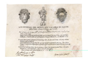 Pergamena stampata con annotazioni e firme manoscritte. In testa al documento : lo stemma mediceo, quello della città di Siena e la Madonna della Misericordia sopra i tre monti, storico simbolo del Monte dei Paschi. Conservato sigillo in carta. Ottime condizioni. Dimensioni : 230x330 mm. (1) -