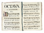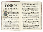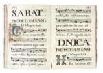 Manoscritto cartaceo a inchiostro nero. Notazione musicale quadrata su tetragrammi. 9 capilettera istoriati e decorati in oro e inchiostri policromi, contornate da motivi floreali ; 26 iniziali decorate a inchiostri policromi e oro. Molte decorazioni floreali a inchiostro nero, ai capilettera e a bordo pagina. Piccoli strappi all'angolo sup. dx di pag. 157 e 211. Alcuni segni di matita azzurra sui primi fogli bianchi. Legatura coeva in piena pelle liscia a 8 nervi, su piatti cartonati, con marcati segni di usura. (1)-