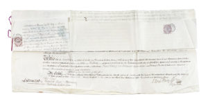 Manoscritto pergamenaceo a inchiostro nero, formato da tre pergamene legate tra loro. Testo in inglese. Conservati : un grande sigillo cartaceo, a secco e in rilievo, con lo stemma della regina Vittoria, un Embossed Tax Stamp (particolare bollo a secco blu, con piccolo inserto metallico lucido : ricevuta pagamento tasse), un sigillo notarile cartaceo rosso con laccetti in seta, vari bolli e annulli inglesi e italiani (Roma). Perfette condizioni. Dimensioni : 630x500 mm. (1)