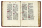 Segnatura : a-b10, c-k8, l6, m-q8, r6. Testo in carattere gotico, su doppia colonna, su 40 righe. Iniziali rubricate in rosso e blu o in rosso e viola, con decorazioni ; titoli e foliazione in rosso ; sottolineature in rosso ai titoli dei capitoli. Lievi fioriture sparse e mancanze reintegrate, senza perdite, alle carte r5-r6. Legatura successiva in piena pelle, montata su assi di legno, con impressioni a secco ai piatti e dorso a 3 nervi. Minime abrasioni. (1)