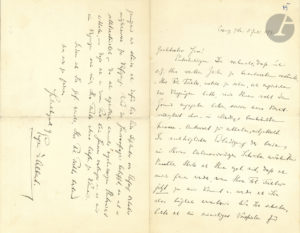 Eugen d’ALBERT (1864-1932). 2 L.A.S., 1894-1901 ; 2 pages in-8 et 1 page oblong in-12 avec adresse ; en allemand. {CR}Coswig 8 juillet 1894, au sujet de représentations et d’honoraires...{CR}Firenze 28 juin 1901, à E. Senffert, de la firme...
