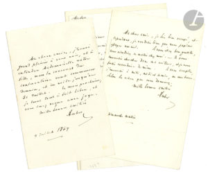Daniel François Esprit AUBER (1782-1871). 4 L.A.S., à divers ; 1 page petit in-8 chaque.{CR}À une amie. Dimanche matin : « je voudrais bien que nous pussions essayer nos airs » ; il l’enverra chercher dans sa voiture pour venir chez...