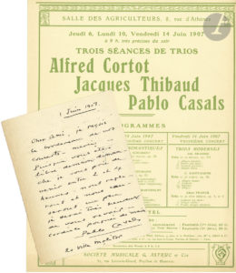 l’affichette-programme de Trois séances de Trios : Alfred Cortot, Jacques Thibaud, Pablo Casals, Salle des Agriculteurs, 6-14 juin 1907.{CR}On joint aussi : Alfred CORTOT. L.A.S., Lausanne 29 juillet 1948, à Jeanne Guionie ; 2 pages in-8 à son en-tête, enveloppe. Il est impossible de créer une nouvelle classe de chant à l’École Normale de Musique, les classes existantes étant largement suffisantes et les professeurs étant rémunérés au nombre des élèves. Plus : une amusante caricature au crayon de Cortot par Pierre Larouy, mars 1920 (in-4) ; un manuscrit autographe d’Édouard Schneider (3 p. in-4, avec tapuscrit corrigé), sur un concert de Cortot à Florence en 1920 ; divers articles et coupures.