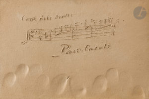 Pablo CASALS (1876-1973). P.A.S. sur terre cuite ; 13 x 19,8 cm.{CR}Pièce exceptionnelle, recueillie dans les années soixante à Prades par Louis Mallais du Carroy (1923-1980), céramiste et mélomane qui avait ses entrées au Festival de...
