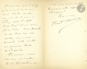 « pour le dîner des Pris de Rhum », mais il sera « exact au premier lundi de Décembre »… – 3 [décembre 1886]. Il ne peut venir au dîner des Pris de Rhum, devant « chauffer un rhume ». Les mélodies de Chabrier sont reportées au concert du 22 janvier : « Mais personne encore ne sait qui les chantera »… – Vendredi [28.I.1887], au sujet de la souscription au « festival Franck […] cette fête de famille offerte à un grand musicien »…{CR}On joint une L.A.S. à Mme Chabrier (2 p. in-12), regrettant de ne pouvoir lui rendre service : « je n’ai que l’édition pour piano seul ! »…