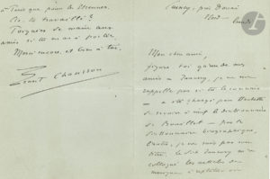 Ernest CHAUSSON (1855-1899). 3 L.A.S., 1890-1894, à son ami le musicologue Julien Tiersot ; 7 pages in-8, 2 enveloppes.{CR}Cuincy près Douai, lundi [19 août 1890]. Son ami Tannery « a été chargé par Hachette de revoir à neuf le...