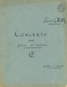 Jean CRAS (1879-1932). Manuscrit musical autographe signé, Concerto pour piano et orchestre, 1931 ; [1]-87 pages in-fol. sous couverture de papier bleu titrée (taches d’encre à quelques feuillets).{CR}{CR}Manuscrit de travail complet de la...