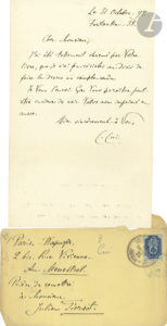 César CUI (1835-1918). L.A.S., [S. Petersbourg] Fontanka 31 octobre 1892, à Julien Tiersot ; demi-page in-8, enveloppe.{CR}« J’ai été tellement charmé par votre livre [Rouget de Lisle], que je n’ai pu résister au désir de faire...