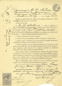 Claude DEBUSSY (1862-1918). P.S. « ClADebussy », Paris 14 mars 1891 ; 1 page petit in-4 en partie impr., timbre fiscal (petite déchirure en bas sans perte de texte).{CR}Traité avec les éditeurs de musique MM. de Choudens Fils, à qui M....