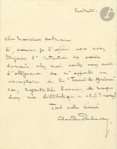 Claude DEBUSSY (1862-1918). L.A.S., Vendredi [1895], à l’éditeur George Hartmann ; 1 page in-12 (photo jointe).{CR}Il le prie de lui apporter, en venant le lendemain chez lui, « un exemplaire de la Tarentelle styrienne car, regrettable...