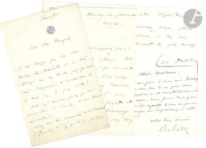 commencement de la semaine prochaine je m’entendrai avec Reinach pour venir vous demander l’hospitalité et j’espère en même temps pouvoir vous jouer une bonne partie de notre dernier acte [Sylvia ?] »… – Samedi [1876 ?], à l’éditeur Henri Heugel, au sujet de son ballet Sylvia ou la Nymphe de Diane. Il ne bouge pas de sa table de travail et est « effrayé de la tâche que je me suis imposée, d’orchestrer en 2 mois ½, 3 gros actes ! Mais, à aucun prix, je ne veux être la cause d’une heure de retard »... Le lendemain a lieu la double audition de Lauwers et de Mlle Fauvelle, « à laquelle on songe pour le rôle de Diane […] Votre opinion aurait un grand poids sur la mienne, toujours si indécise ; et il s’agit là d’une question capitale !»...{CR}Paris 3 février [1879], à son ami viennois Felix, lui demandant des nouvelles de Vienne, et le priant de retirer Le Roi l’a dit des « ruines du Komische Oper » pour le porter à l’Opéra. « Je me suis remis ferme à Jean de Nivelle qui sera définitivement logé à l’Opéra-Comique et que j’espère donner avant la fin de l’exposition, vers l’automne »… Il évoque le gros succès du Petit Duc : « au point de vue artistique et purement musical je dois détester ça […] A-t-on joué chez vous le Rheingold ? Voilà qui est sérieux à la bonne heure »… – Saint-Germain 23 septembre [1879], à la cantatrice Juliette Bilbaut-Vauchelet, au sujet de son rôle dans Jean de Nivelle, avec post-scriptum du librettiste Philippe Gille (photographie dédicacée de la chanteuse jointe). – [1879, à Henri Heugel ?], au sujet de Jean de Nivelle et la distribution dont il a parlé avec Carvalho, Ph. Gille et Gondinet…