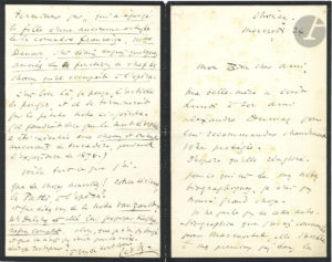 Léo DELIBES (1836-1891). L.A.S., Choisy mercredi 24 [1890 ?], à un ami ; 4 pages in-8 (petit deuil).{CR}Sa belle-mère a écrit à son ami Alexandre Dumas pour recommander la protégée de son correspondant. Puis il passe en revue les notices...