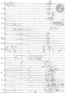 Pascal DUSAPIN (né 1955). Manuscrit musical autographe signé, [Passion], 2008 ; 1 page et quart grand in-fol. (42 x 30 cm).{CR}Esquisse de travail d’une page (131) de son opéra Passion, créé au Festival d’Aix-en-Provence le 29 juin...