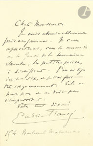 Gabriel FAURÉ (1845-1924). L.A.S. ; 1 page in-8, montée sous passe-partout avec photo.{CR}Il est très pris, et apportera bientôt « les petites pièces à déchiffrer. J’en ai déjà écrit six, et je l’ai fait très soigneusement. Cela ne...
