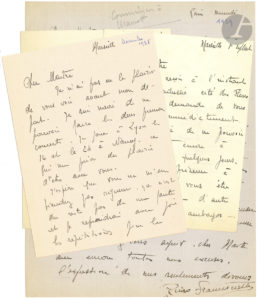 Nancy »... Paris mercredi [février 1929] : souffrant de « troubles et tremblements nerveux », il doit prendre un repos complet et ne pourra reprendre sa place à l’orchestre avant mars... Marseille 1er septembre : il est à Marseille pour quelques jours, mais si sa présence peut lui être agréable et si « sans ambages, j’ai intérêt à y être », il avancera son départ... Marseille 9 octobre : engagé le 13 janvier comme soliste à l’Orchestre de Paris, il est privé du plaisir de jouer sous sa baguette : « Est-ce bien sans rémission ? »... On joint un double de réponse dactyl.