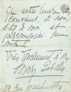 Mary GARDEN (1874-1967). L.A.S., [Paris] 39 rue Washington ; 2 pages in-8 à son chiffre (trous de classeur).{CR}Elle sera heureuse de recevoir chez elle son correspondant jeudi vers 6 heures.