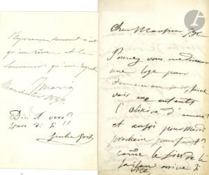 n’étant pas complètement rétablie... {CR}8 juillet, à un ami Augusto, le chargeant de distribuer les pensions pour son père et pour sa mère…{CR}[8 juillet 1864], à Frederick Gye, au Royal Italian Opera au Lyceum : « Pouvez-vous me donner une loge pour demain au soir, faire voir aux enfants L’elixire d’amour ? et aussi pour mardi prochain pour Faust ? »...{CR}On joint une page d’album a.s. par elle et son mari le ténor MARIO (Manchester 1849), et une L.A.S. de Mario, Londres 29 janvier 1864, à Mr Mason, acceptant de chanter à son Festival (portrait joint).