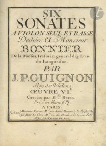 Madame Boivin et le Sieur Le Clerc, [1743]) ; in-fol., [2 ff.]-35 p., cartonnage papier marbré de l’époque (dos usé).{CR}Rare première édition de ce deuxième recueil de Sonates pour violon et basse continue de Guignon (RISM A/I G 5048). Quelques légères mouillures.{CR}Giovanni Pietro Ghignone, originaire de Turin, entra en 1733 à la Chapelle royale, et francisa alors son nom ; naturalisé en 1741, il fut un des principaux introducteurs de Vivaldi en France ; disciple de Somis, ses talents lui valurent le surnom de « Roy des violonistes ».{CR}Cet opus est dédié au financier et mécène Joseph Bonnier de la Mosson (1702-1744), avec une louangeuse dédicace gravée en tête du recueil : « Deux choses également guidé dans la conduite de l’ouvrage que je vous présente, l’Imagination pour le composer ; le Jugement, pour vous l’offrir ; et je me fais un honneur marqué de publier que je ne me suis pas senty plus entrainé par le désir de faire du Beau, que par l’idée flateuse d’être aplaudi d’un Connoisseur tel que vous »…{CR}Provenance : collection du violoniste Henri Vieuxtemps.