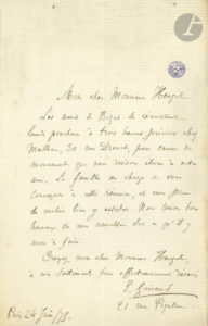 Ernest GUIRAUD (1837-1892). 3 L.A.S, 1875-1891, à Jacques-Léopold et Henri Heugel ; 3 pages et quart in8 (petite tache à une lettre) et 1 page in12 avec adresse.{CR}24 juin 1875 : « Les amis de Bizet » vont se réunir chez Meilhac « pour...