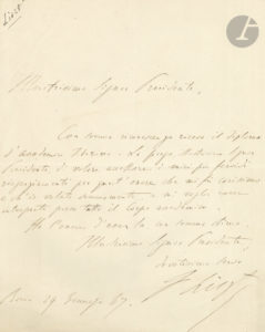 Franz LISZT (1811-1886). L.A.S., Rome 29 janvier 1867, au Président de l’Accademia Tiberina ; 1 page in-4 ; en italien.{CR}Il est très reconnaissant de recevoir le diplôme d’académicien de l’Accademia Tiberina, et remercie avec ferveur...