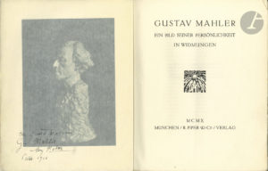 anniversaire de Mahler, avec textes de G. Hauptmann, H. von Hofmannsthal, St. Zweig, R. Rolland, R. Strauss, A. Schnitzler, P. Dukas, B. Walter, A. Casella, etc.{CR}Fac-similés musicaux de J. Bittner et Max Reger ; reproductions du buste de Mahler par Rodin (avec fac-similé de dédicace de Rodin à Mahler sur serpente) et d’un tableau de Klimt.{CR}Feuillet joint : Gustav Mahlers Werke in der Universal-Edition.