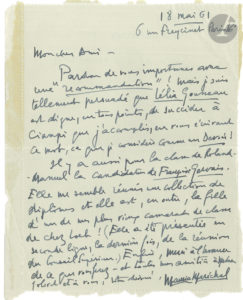 1964, remerciant pour l’envoi de son Concerto (pour violoncelle) et sa belle dédicace : « je vais le mijoter aux petits oignons ! »…