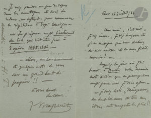 […] Ah ! J’ai terminé l’orchestre de Manon cette nuit – on veut passer du 15 au 20 Xbre de cette année – c’est Heilbronn que j’ai fait engager pour créer Manon. – Je vais prendre un peu de repos dans les montagnes et serai de retour en septembre pour commencer les répétitions à l’op. comique. – Je prépare aussi l’achèvement du Cid qui doit être joué à l’opéra 1885 1886 »…{CR}Bruxelles 27 février 1884 … « Enfin, Manon a vu le feu de la rampe – elle le voit même trois fois par semaine devant une nombreuse assemblée. […] Je reviens à Paris dans quelques jours, puis je retourne en Belgique pour la première de Manon. – Vous aurez appris aussi que Hérodiade se joue au th. Italien avec un vrai succès ! »…{CR}On joint 2 autres L.A.S. : Paris 7 avril 1875 (il a subi de rudes épreuves) et Bordeaux avril 1887 (recommandant à des directeurs et amis Mme de Tubino qui a « une très belle voix de falcon »).