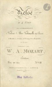 [1 f. de titre]-302 p. ; rel. moderne demi-toile bleue.{CR}Première édition de la partition d’orchestre de cette Messe faussement attribuée à Mozart [KV Anh. C1.04]. Texte et musique gravés.{CR}Cette messe en sol majeur avait été publiée pour la première fois sous le nom de Mozart par l’éditeur londonien Novello sous le titre de « douzième messe » de Mozart dans une édition de 1819 de The Voices. Selon des recherches récentes, l’auteur serait probablement le compositeur de théâtre viennois Wenzel Müller (1767-1835). La messe a probablement été écrite entre la mort de Mozart en 1791 et 1803, lorsqu’un manuscrit de la messe fut mentionné pour la première fois dans un catalogue de bibliothèque. Il était auparavant attribué au professeur de musique et éditeur de Mayence, Carl Zulehner (1770-1841), qui envoya le manuscrit à Simrock. On a également supposé que la musique pouvait provenir de différents compositeurs. Néanmoins, la messe ne manque pas de qualité musicale et d’originalité, notamment la section fuguée du « Cum sancto spiritu » dans le Gloria est très proche du langage musical de Mozart.{CR}Cachet sur la page de titre de Max Keldorfer (1864-1939), compositeur et chef de chœur autrichien.