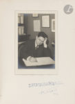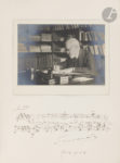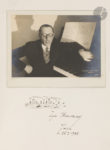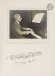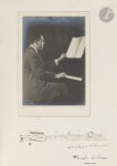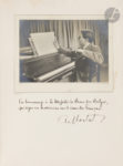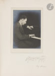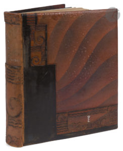 (33 x 24 cm) montés sur onglets, chacune précédée d’une serpente avec le nom du musicien inscrit à l’encre de Chine ; le tout relié en un fort volume in-4 (33,5 x 29 cm), veau fauve teinté à décor de formes ondulées sur les plats, mosaïqué sur un bord de larges bandes de box noir et d’un décor de maroquin brun imitant des motifs de ferronnerie, répétés sur le dos, chiffre E couronné frappé en argent au bas du plat sup. ; large cadre intérieur de box noir mosaïqué dans les coins, doublures et gardes de soie peinte représentant des paysages avec des oiseaux (signé AC), contregardes de papier bleu, tranches argentées (signée Anita Conti 1931).{CR}Précieux album de la Reine Élisabeth de Belgique, mélomane passionnée.{CR}La Reine Élisabeth de Belgique, née Wittelsbach (1876-1965), veuve d’Albert Ier de Belgique, fut une fervente mélomane. Violoniste elle-même, elle créa en 1937 le prestigieux concours musical qui porte son nom.{CR}L’album s’ouvre sur une page de titre calligraphiée en lettres capitales : Quelques musiciens vus par Lipnitski 109 Faubourg St Honoré Paris. Boris LIPNITZKI (1887-1971), d’origine ukrainienne, fut un photographe renommé dans le monde des arts et du spectacle des années trente.{CR}26 citations musicales et dédicaces accompagnent les photographies, par Louis AUBERT (4 mesures de sa Sonate pour piano et violon), Conrad BECK (3 mesures de son Concerto pour quatuor à cordes), Louis BEYDTS (6 mesures sur les paroles « Laissons ce divin Messager Pousser, pousser l’escarpolette »), Alfred CORTOT (dédicace : « En hommage à Sa Majesté la Reine des Belges, qui règne en Souveraine sur le cœur des Français »), Paul DUKAS (3 mesures d’Ariane et Barbe-Bleue, sur 2 portées : chant et accompagnement, avec paroles : « Les cinq filles d’Orlamonde (La fée noire est morte) »), Pierre-Octave FERROUD (4 mesures pour hautbois), Tibor HARSANYI (4 mesures), Arthur HOÉRÉE (4 mesures de la “Chanson” de son Septuor avec paroles : « Le Bonheur est dans le pré, cours-y vite, cours-y vite »), Arthur HONEGGER (3 mesures d’Antigone), Arthur HONEGGER (avec le Quatuor de Bruxelles, 2 mesures de son quatuor à cordes), Jacques IBERT (3 mesures Andante), Wanda LANDOWSKA (air et paroles de Podolanka, « chant populaire polonais »), Igor MARKEVITCH (5 mesures de sa Sérénade), Bohuslav MARTINU (5 mesures de Les Rondes), Marcel MIHALOVICI (3 mesures), Darius MILHAUD (2 mesures), Nicolas NABOKOV (4 mesures de sa Symphonie lyrique), Francis POULENC (4 mesures du Sextuor), Maurice RAVEL (3 mesures de la Sonate pour piano et violon), Jean RIVIER (3 mesures de sa Symphonie en ré majeur), ROLAND-MANUEL (3 mesures de son Concerto pour clavecin et instruments), Guy ROPARTZ (4 mesures de sa 1ère Sonate pour violon et piano), Albert ROUSSEL (4 mesures du Psaume LXXX), Florent SCHMITT (2 mesures de sa « dernière symphonie »), Igor STRAWINSKY (thème initial du Sacre du Printemps, daté Paris le 25.I.1932), Alexandre TANSMAN (2 mesures de sa Symphonie concertante).{CR}Photographies : Ernest Ansermet, Georges Auric, Lucien Capet, Pablo Casals, Alfredo Casella, Désiré Defauw, Marcel Delannoy, Serge de Diaghilev (photo de groupe avec Benois, Grigoriev, Karsavina, Lifar, Nijinsky), Manuel de Falla, Jascha Heifetz, Charles Houdret, Bronislaw Hubermann, Vincent d’Indy, Serge Prokofiev, Henri Sauguet.{CR}Remarquable reliure Art Déco signée par Anita CONTI (1899-1997), relieuse d’art d’origine arménienne (elle exposa notamment ses reliures au Salon d’Automne de 1932 à 1935), qui devint la première femme océanographe française.{CR}Plats et charnières de la reliure un peu frottés.