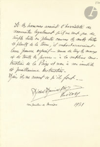 MUSIQUE et SPECTACLE. 29 P.A.S. ; chacune sur une page grand in-fol.{CR}Pensées sur la Paix, par des musiciens, chanteurs et comédiens, destinées à être reproduites en fac-similé dans le livre Pax Mundi. Livre d’or de la Paix. Enquête...