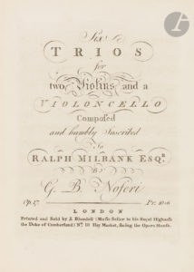 vert olive, large frise dorée d’encadrement sur les plats, pièces de titre en maroquin rouge avec lettres et cadre dorés sur les plats sup., dos ornés, tranches dorées.{CR}Très bel exemplaire de dédicace de ces sonates en trio, dédiées au beau-père de Byron.{CR}Noferi, violoniste et guitariste italien, vécut en Angleterre, notamment à Cambridge, Durham et à Londres, où il mourut, et où il joua au King’s Theatre et pour Johann Christian Bach et Friedrich Abel.{CR}Musique gravée, en trois parties : Violino primo, Violino secondo et Basso.{CR}Malgré le titre, chaque pièce est désignée comme « Sonata » dans la partition. On remarquera le rôle développé du violoncelle, sortant de l’usage habituel de la basse, notamment dans le Minuetto de la Sonata V et le Largo de la Sonata VI.{CR}Les pièces de titre sur les riches reliures sont ainsi rédigées : Noferi’s Trios inscribed to Ralph Milbank Esqr , montrant qu’il s’agit de l’exemplaire du dédicataire, Ralph Milbank, 6th Baronet (1747-1825), membre du Parlement pour le comté de Durham ; sa fille Anne Isabella surnommée Annabella (1792-1860) épousa Lord Byron.