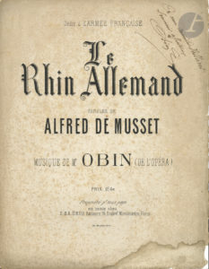 Louis-Henry OBIN (1820-1895). Le Rhin Allemand. Paroles de Alfred de Musset (Paris, E. & A. Girod, s.d.) ; in-4, broché (rousseurs et mouillure, bord effrangé).{CR}Mélodie composée par la célèbre basse de l’Opéra sur le fameux poème...