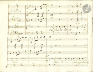 donna che amante »…, avec orchestre (20 p.). – Ariette dans L’Italiana in Londra « composé par M. Mengozzi » : « Se m’abbandoni moi dolce amore »… (17 p.).{CR}[Giuseppe GAZZANIGA]. Le Vendemie. Rondo del Sigr Mengozzi : « Solo chi sente amore »… (oblong in-8, 30 p.).{CR}[Andrea LUCCHESI]. Duettino « Idol mio moi ben amato »… d’Ademira, daté « 1787 in Vicenza » (6 p.).{CR}Gian Francesco di MAJO. Aria « Agitato vedo il mare »… (oblong in-8, 22 p.).{CR}Simon MAYR. Scena e Duetto « Parto ti lascio oh Dio » de Lodoiska (28 p.).{CR}Giovanni PAISIELLO. – Scena di Paesiello, air d’Aristea extrait de L’Olimpiade (21 p.). – Il Tamburro notturno. Duetto del Sigr Mengozzi : « Vaghe luci, amato bene »… (40 p., couverture illustrée de Croce Marchand de musique et Copiste du Théâtre de Monsieur).{CR}Antonio SALIERI. Duettino « Ah se gli affetti miei »… [d’Europa riconosciuta], daté « 1778 in Milano » (12 p.).{CR}Giovanni Battista VIOTTI. La cosa rara. Polacca : « Consola amato bene »… (36 p., couverture illustrée de Croce Marchand de musique et Copiste du Théâtre de Monsieur).{CR}Niccolo Antonio ZINGARELLI. Aria « Parto ma tu ben moi »… (13 p.).{CR}On joint : – 2 manuscrits d’ariettes avec piano de Vincenzo RIGHINI : XII Ariette italiane (24 p.) et Ariette Italiane (20 p.) ; – 2 manuscrits d’airs avec basse d’Antonio SACCHINI : Rondeau « Si mio ben sarò fedele » (4 p.) ; 8 Duetti a due voci con basso (22 p.).