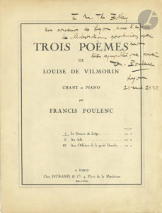Francis POULENC (1899-1963). Trois Poèmes de Louise de Vilmorin. I (Paris, Durand, 1938) ; in-fol. (bords un peu effrangés).{CR}Première mélodie du recueil (I Le Garçon de Liège) avec envoi a.s. sur la couverture : « à M. Th. Holley en...