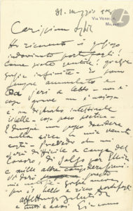 goût, et remercie son amie. Il est encore malade et alité ; rien de grave, mais c’est ennuyeux ; un trouble intestinal peu poétique : « Io sono sempre ammalato e da ieri a letto – non è cosa grave ma è nojoso è un disturbo intestinale ribelle – cosa poco poetica ». Il ne peut donc rien décider quant à sa venue, mais ce sera difficile à cause du travail et aussi à cause d’Elvira et mille autres considérations… Au verso, il ajoute quelques mots à l’encre rouge pour demander quand Nellie Melba chantera Tosca.